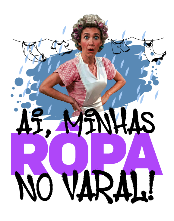 Com a frase "AI, MINHAS RÔPA NO VARAL!" em uma tipografia que grita mais alto que a própria personagem, essa peça é uma ode ao caos do cotidiano brasileiro. O erro gramatical proposital no "ROPA" é o toque de mestre que traz a autenticidade do desespero de quem não tem tempo para concordância verbal quando o lençol está encharcando. É a estampa perfeita para quem vive na corda bamba entre a vida adulta funcional e o completo colapso nervoso toda vez que o clima decide não colaborar. Vista isso e avise ao mundo: você é uma pessoa ocupada, estressada e, provavelmente, está com a máquina de lavar cheia agora mesmo.
